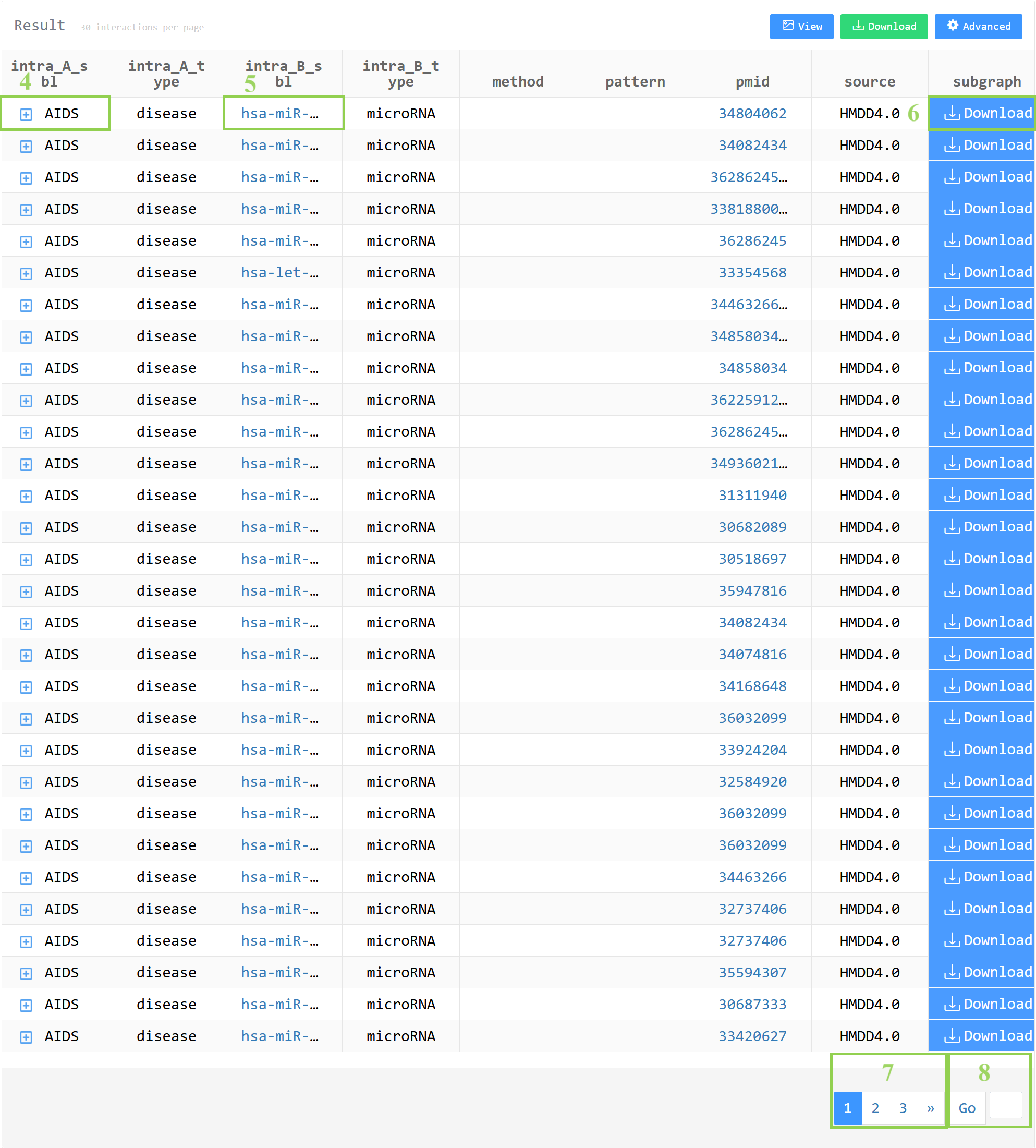 There are two forms, lists and graphs, to represent the results. Besides, all interactions are listed with basic information.